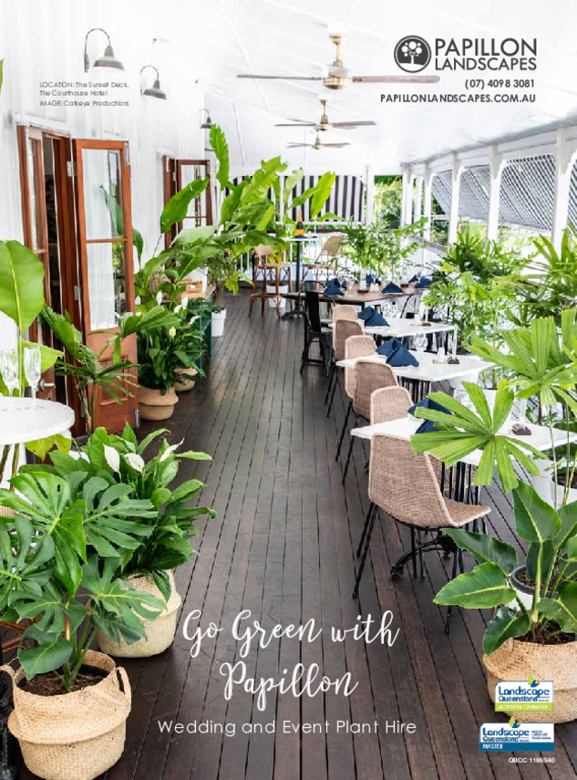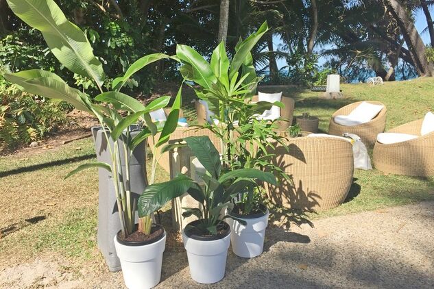 Papillon Landscapes hires beautiful plants for weddings and events. We have many shapes, sizes and varieties, all with lush and full green foliage. Ask us what is available for the season and we will help you find the perfect plants. Choose from formal white pots or a more relaxed sea grass basket for display. We deliver to site and can style your space to help create your beautiful tropical event!